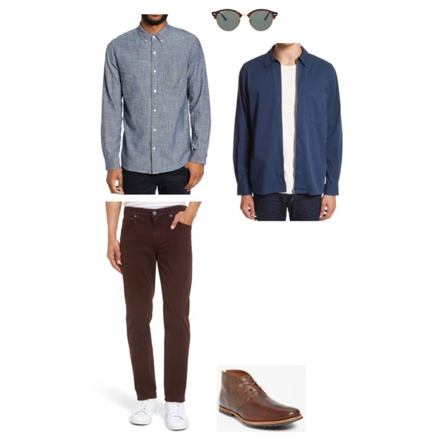 I love making men branch out when it comes to the color of their jeans. Burgundy is an awesome stepping stone for those who are skeptical of colored bottoms. Neutral tones and blues are easy to match with earthy tones.
